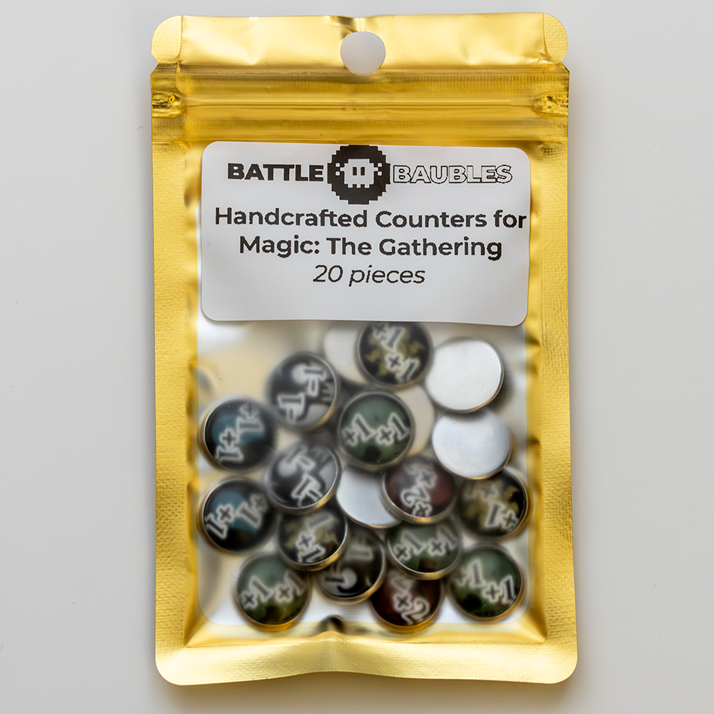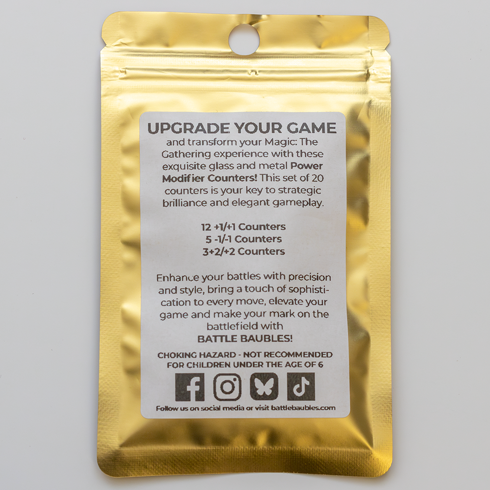 UPGRADE YOUR GAME and transform your Magic: The Gathering experience with our exquisite set of glass and metal Power Modifier Counters! This meticulously crafted collection of 20 counters is your key to strategic brilliance and elegant gameplay.