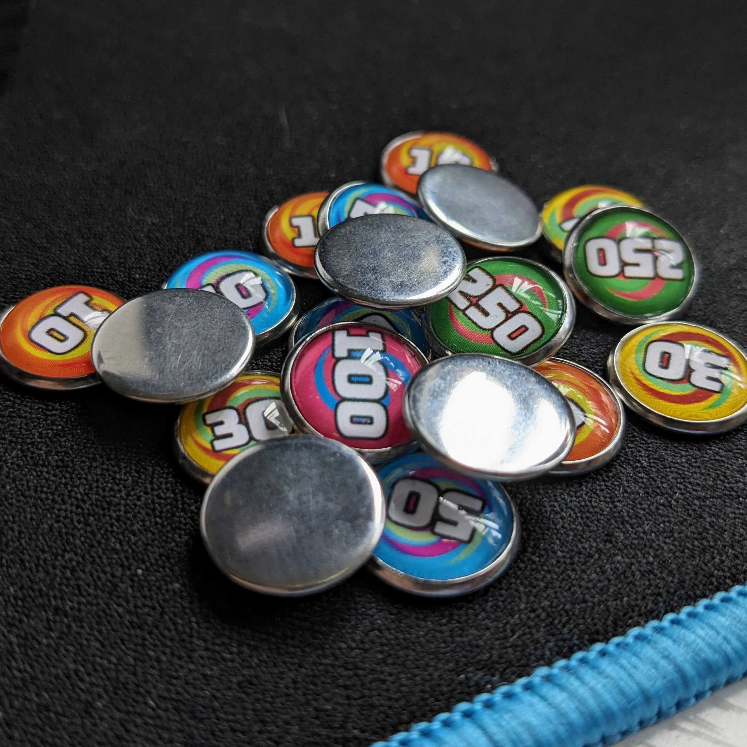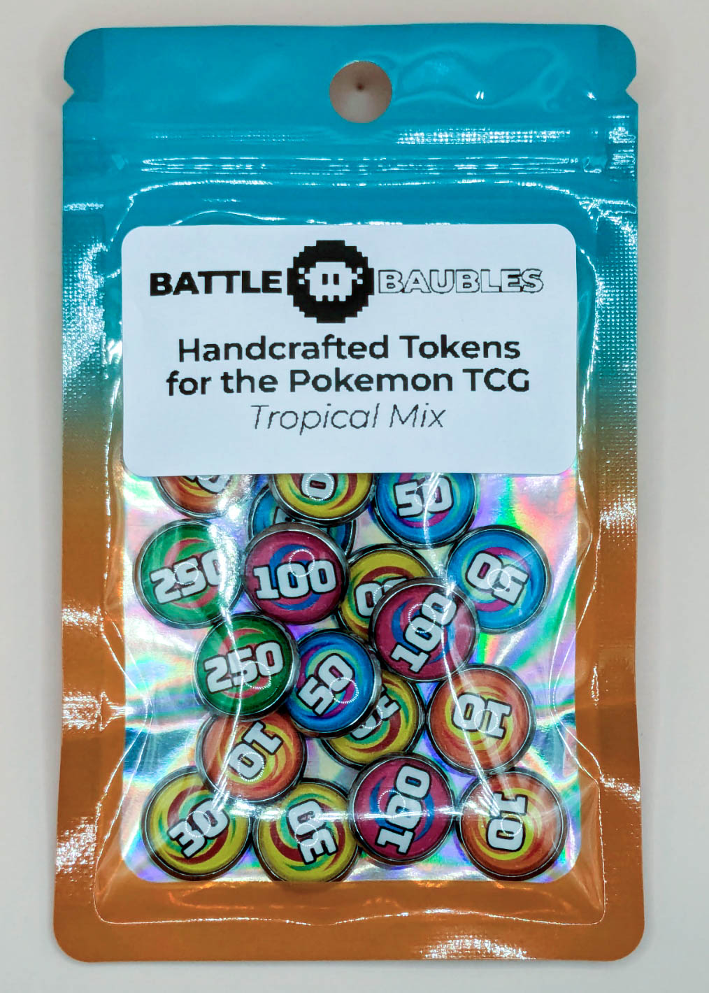 Each set of tokens includes twenty (20) counters in tropical candy colors – 5x each 10/30/50 Damage, 3x 100 Damage, and 2x 250 Damage tokens.